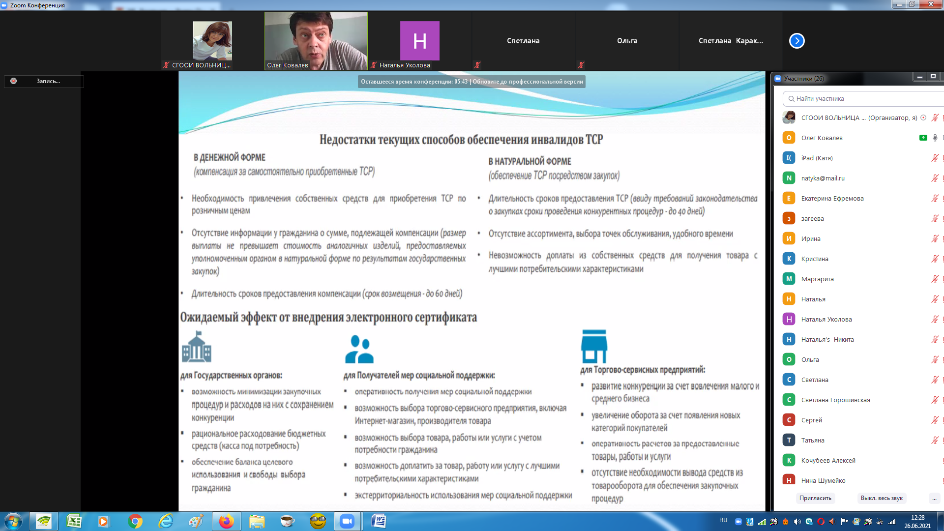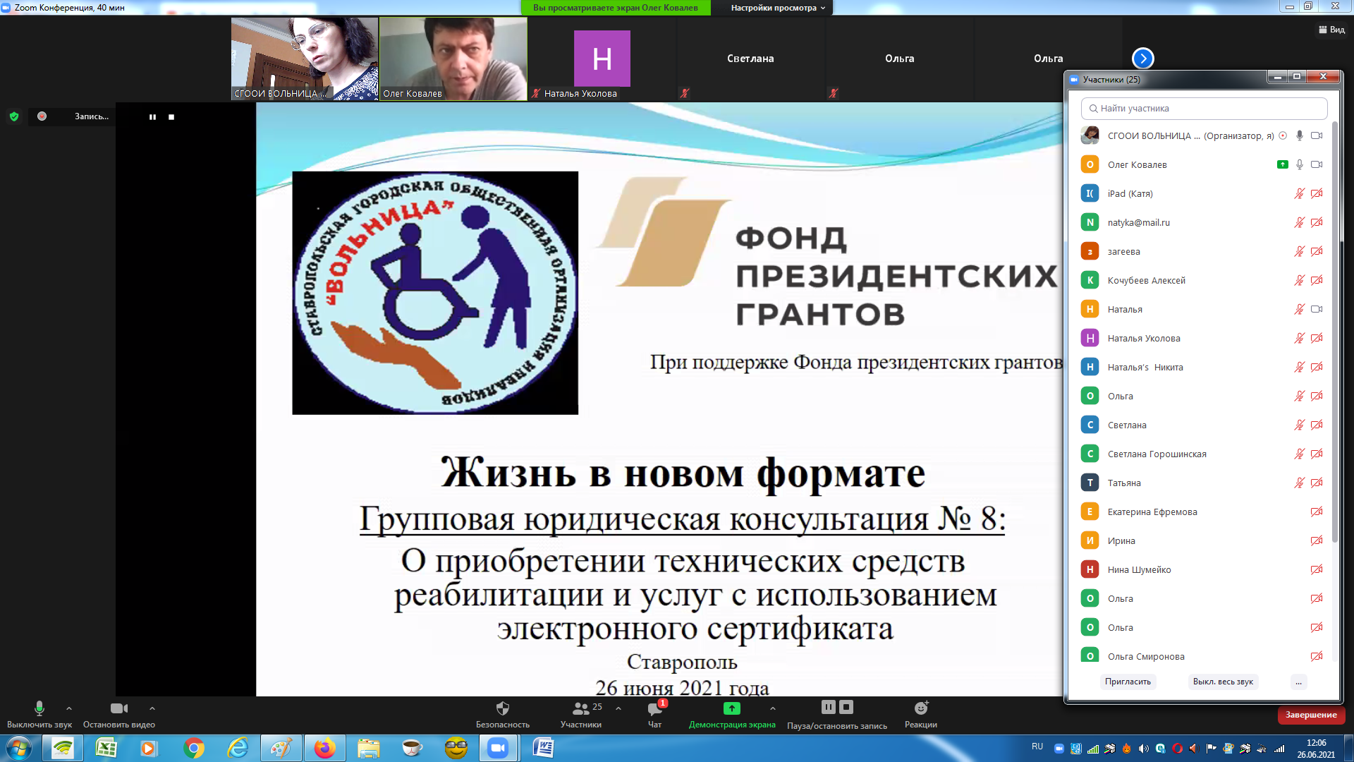 26 июня 2021 года в рамках социально значимого проекта «Жизнь в новом формате» юристом Ставропольской городской общественной организации инвалидов «Вольница» Олегом Ковалевым была проведена групповая юридическая консультация на тему: «О приобретении технических средств реабилитации и услуг с использованием электронного сертификата». Проект реализуется с использованием гранта Президента Российской Федерации, предоставленного Фондом президентских грантов.