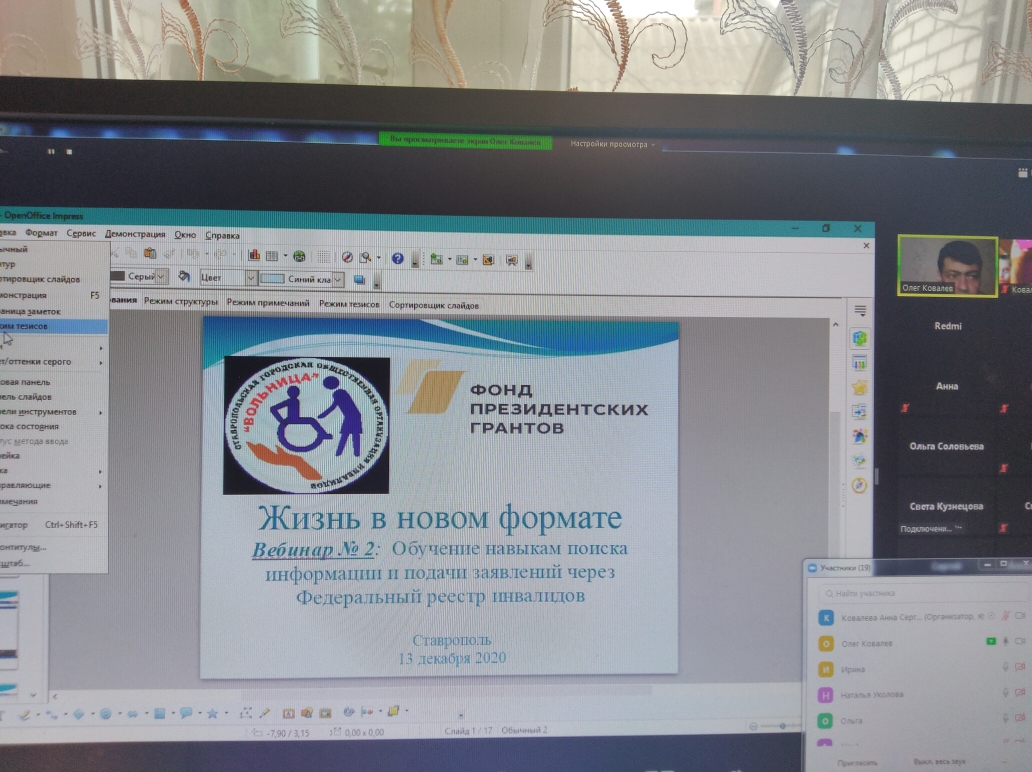 13 декабря 2020 года в рамках социально значимого проекта «Жизнь в новом формате», реализуемого с использованием гранта Президента Российской Федерации, предоставленного Фондом президентских грантов, Ставропольской городской общественной организации инвалидов «Вольница» был проведен второй вебинар по обучению навыкам получения информации и необходимых услуг посредством сети «Интернет». На данном вебинаре слушатели узнали о том, что такое Федеральный реестр инвалидов, для чего он нужен и как организован, кто и как может войти в личный кабинет на сайте.