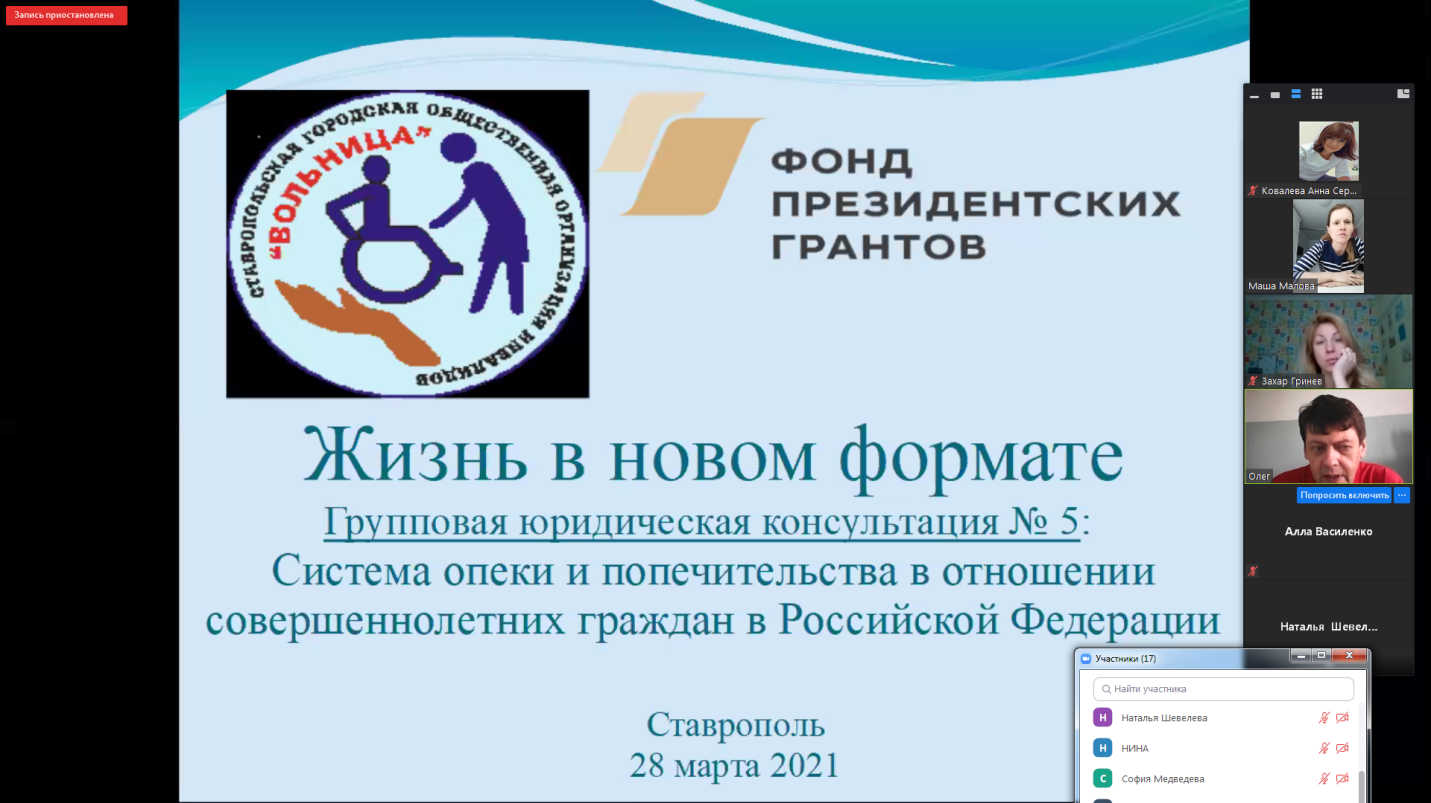 28 марта 2021 года в рамках реализации социально значимого проекта "Жизнь в новом формате" юристом СГООИ "Вольница" Олегом Ковалевым была проведена очередная групповая юридическая консультация по вопросам прав родителей детей с инвалидностью. Проект реализуется с использованием гранта Президента Российской Федерации, предоставленного Фондом президентских грантов.