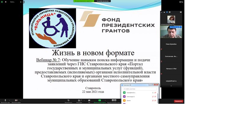 22 мая 2021 года Ставропольской городской общественной организацией инвалидов «Вольница» в рамках социально значимого проекта «Жизнь в новом формате», реализуемого с использованием гранта Президента Российской Федерации, предоставленного Фондом президентских грантов, был проведен очередной вебинар по обучению навыкам получения информации и необходимых услуг посредством сети «Интернет».